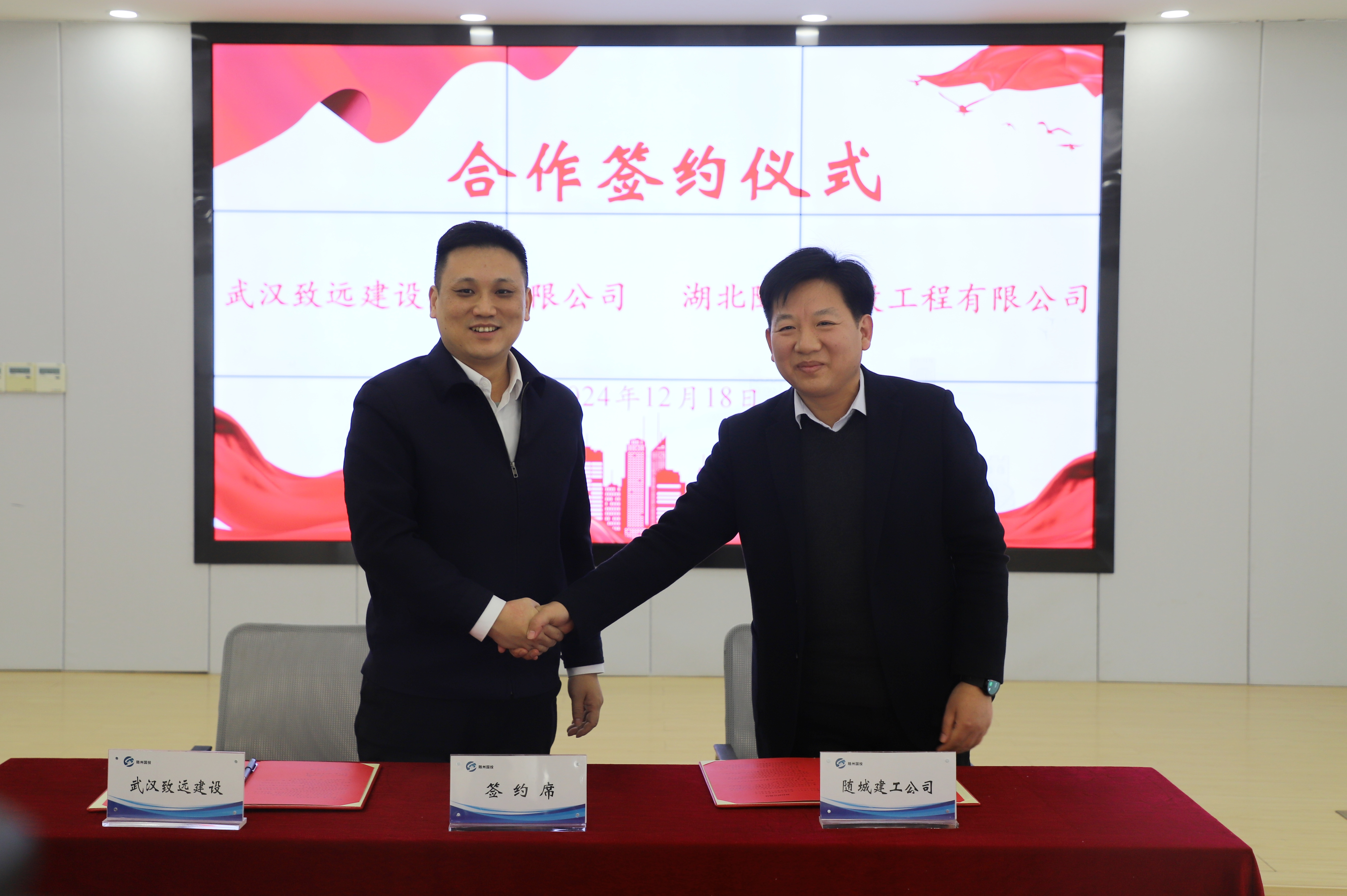12月18日,漢陽市政致遠建設(shè)與隨州國投旗下隨城建工公司簽署合作協(xié)議,達成戰(zhàn)略合作。隨州國有資本投資運營集團有限公司黨委書記、董事長付濤,黨委副書記、總經(jīng)理桂維國,副總經(jīng)理、隨城建工公司董事長姜華明。漢陽市政黨委書記、董事長嚴(yán)悌文,黨委委員、總工程師盧永紅,致遠建設(shè)黨委書記、董事長蘇琦等出席簽約儀式。